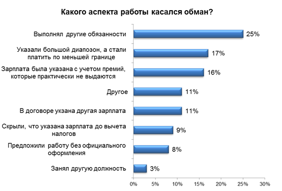 Как работодатели обманывали своих сотрудников или соискателей, выяснил HeadHunter Беларусь, проект RABOTA.TUT.BY в ходе опроса 1143 респондентов. 76% опрошенных соискателей в Беларуси сталкивались с обманом работодателей. Как показало исследование, четверть опрошенных сотрудников выполняли не те обязанности, о которых они договаривались с работодателем в ходе собеседования. Еще 17% попались на уловку, когда при приеме на работу указывался широкий диапазон зарплаты, а по итогу работнику выплачивали деньги по нижней границе. Почти такое же количество людей (16%) отметили, что изначально им обещали помимо зарплаты премии, которые по каким-то причинам никогда не выплачивались.