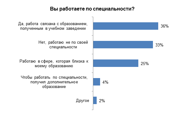 Каждый третий работает не по специальности, а отсутствие профильного образования редко бывает причиной отказа при трудоустройстве. К такому выводу пришел исследовательский центр HeadHunter Беларусь, проект RABOTA.TUT.BY в ходе опроса 1123 респондентов. Как и следовало ожидать, самый высокий процент тех, кто работает сейчас не по специальности, в сфере продаж. А в сфере «Медицина и фармацевтика» все, принявшие участие в опросе, работают по специальности. Также низкий процент таких – в сфере «Наука и образование», «Бухгалтерия, управленческий учет, финансы предприятия». В других популярных сферах специалистов без профильного образования в среднем 30%. Это и маркетологи, и логисты, и представители сферы «Информационные технологии, телеком», «Банки, инвестиции, лизинг». Только 4% респондентов отметили, что им пришлось получить дополнительное образование, чтобы работать по специальности.