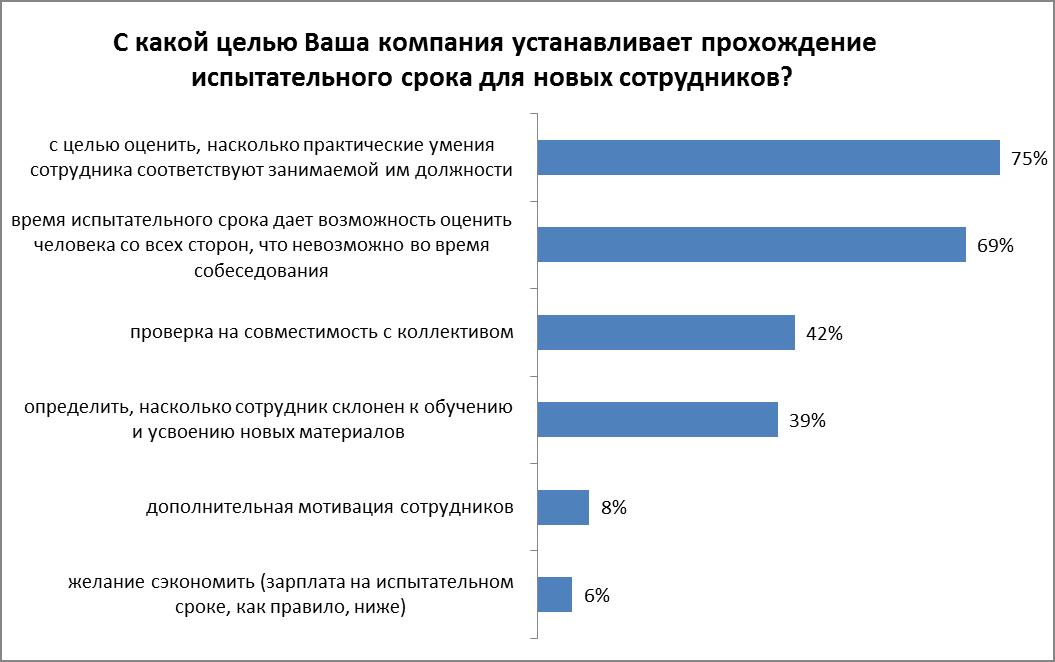 85% работодателей всегда предлагают новым сотрудникам прохождение испытательного срока, и еще 15% принимают решение о введении испытательного срока в зависимости от ситуации и квалификации сотрудника. Половина работодателей придерживаются трехмесячного испытательного срока, треть – сокращают этот период до 1-2 месяцев. Встречаются случаи как более длительного, так и сокращенного испытательного срока. Предлагая прохождение испытательного срока, работодатель ставит перед собой несколько целей. Прежде всего, это оценить практические умения и навыки сотрудника, чтобы выявить, насколько он соответствует предлагаемой ему должности 75%, оценить все достоинства и недостатки, оценить поведение в различных ситуациях 69%, определить, насколько легко новый сотрудник влился в рабочий коллектив 42%, насколько он способен к обучению и усвоению новой информации 39%.