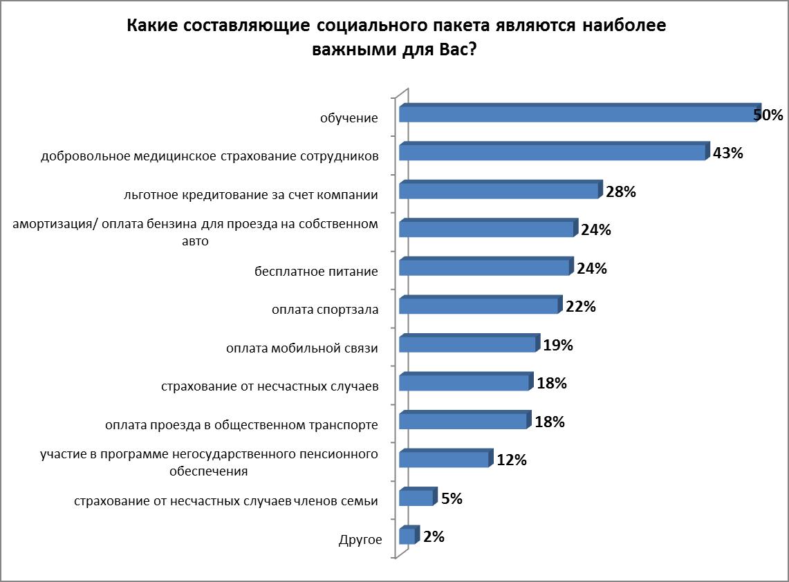 Большинство белорусов уверены в том, что наличие хорошего социального пакета положительно сказывается на мотивации сотрудников и, как следствие, на качестве их работы. По результатам исследования обучение за счет компании (50%) и добровольное медицинское страхование (43%) являются наиболее важными составляющими социального пакета. Также при поиске работы соискатели обращают внимание на возможность льготного кредитования, компенсацию проезда, питания, оплата мобильного телефона, возможность посещать спортивные секции.